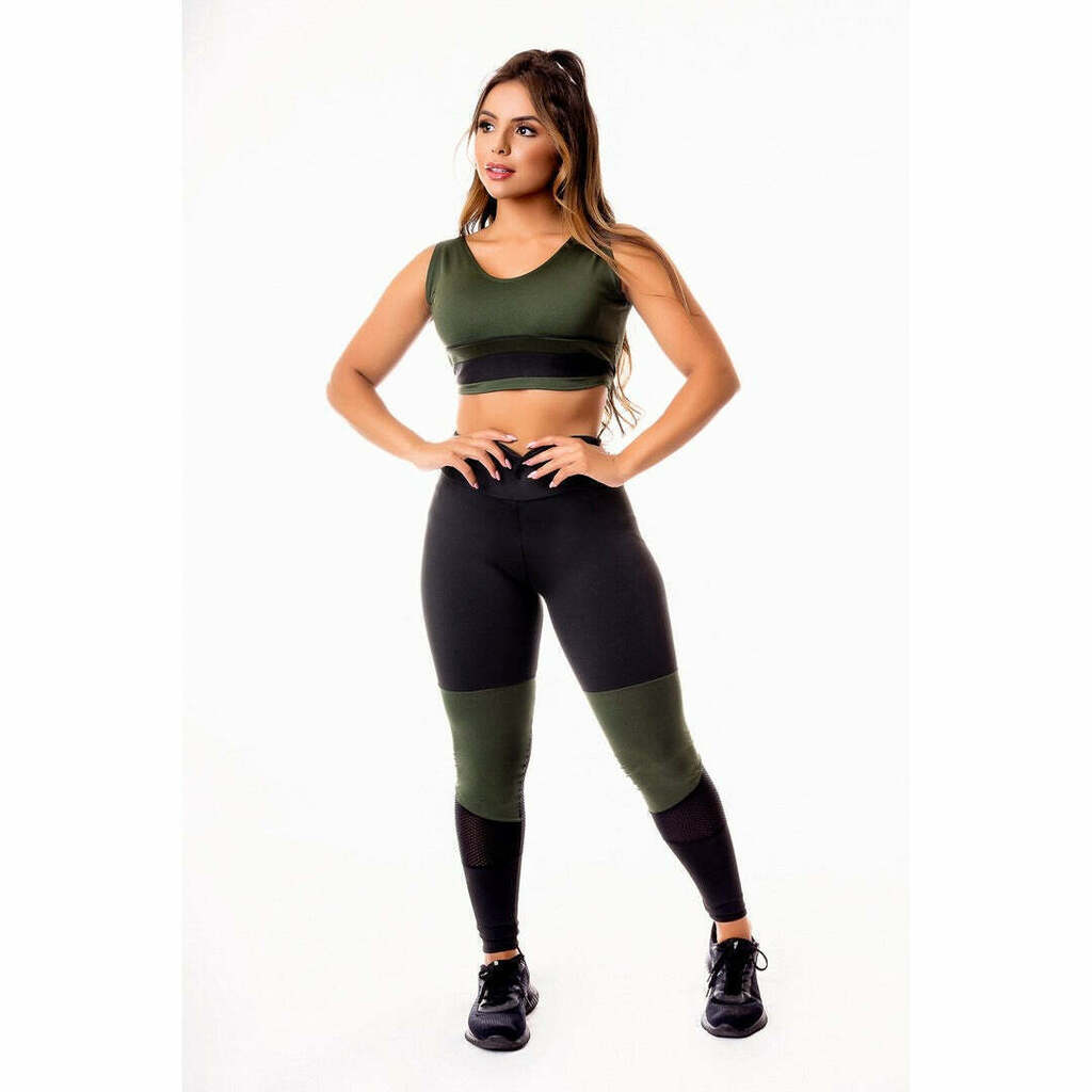 Conjunto Calça Legging Preta com Verde Militar Cintura Alta e Cropped Regata com Detalhes em Tela | REF: CSV7