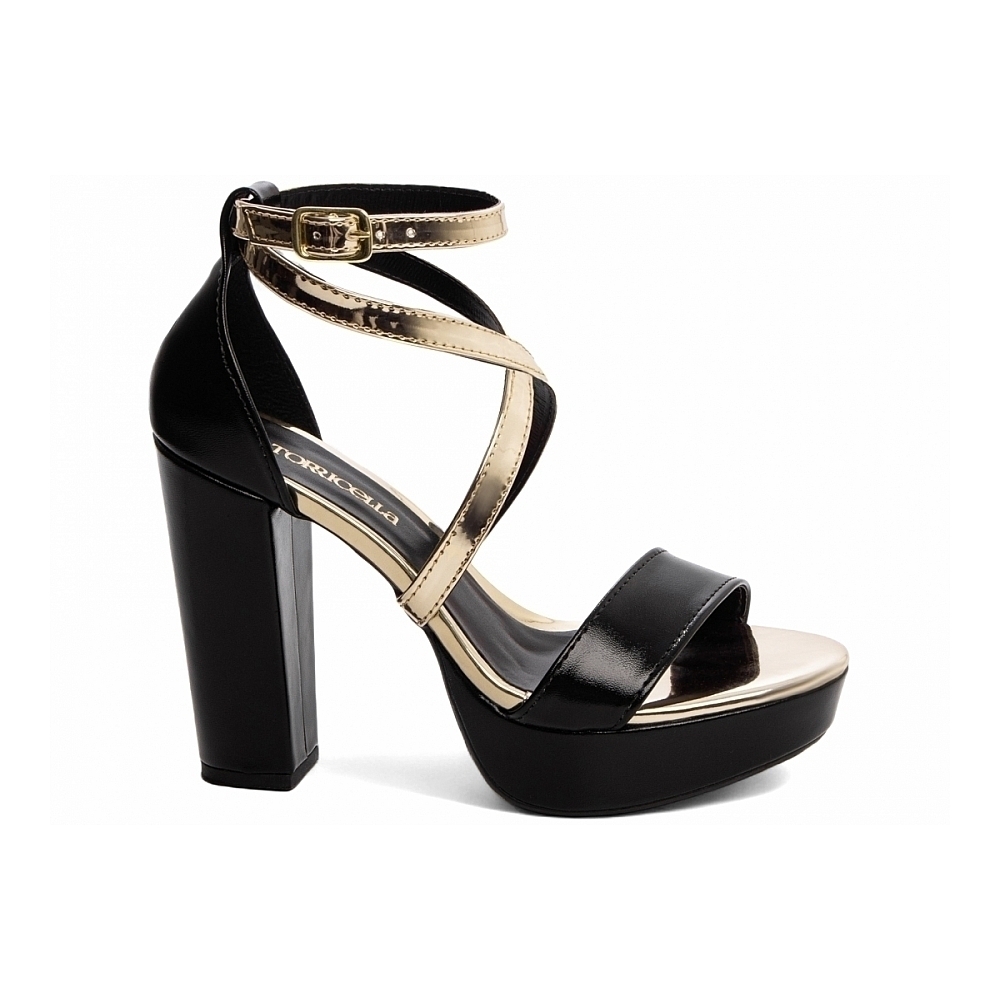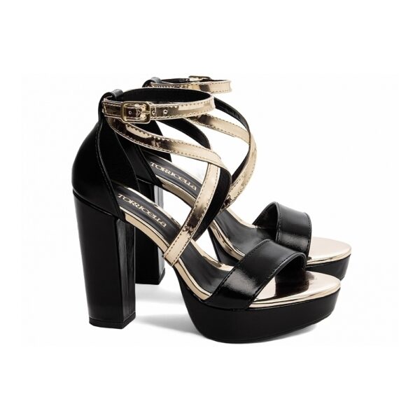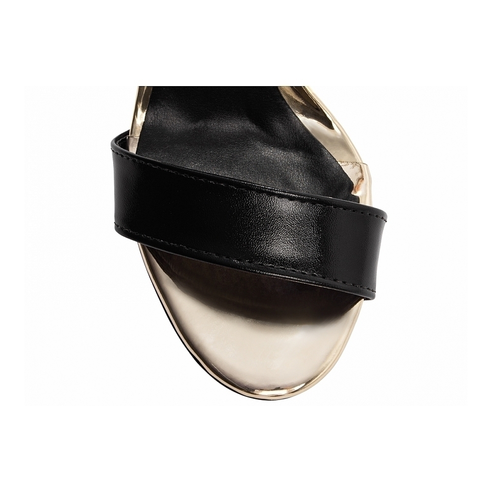 Palmilha: 8 mm de Espessura, Espuma em EVA, Revestida em Verniz Metalizado Specchio Ouro Light e Taloneira Napa Preto;