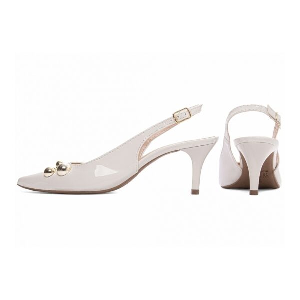 Palmilha: 8 mm de Espessura, Espuma em EVA, Revestida em Verniz Off White e Taloneira Napa Bege;