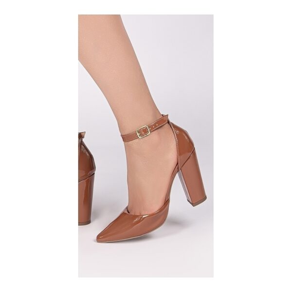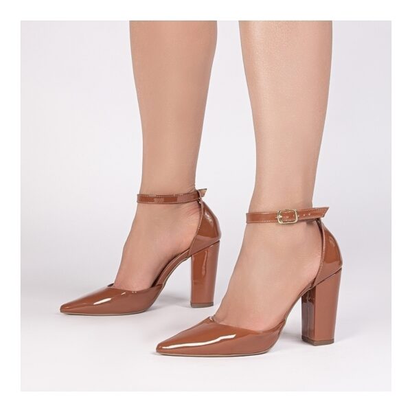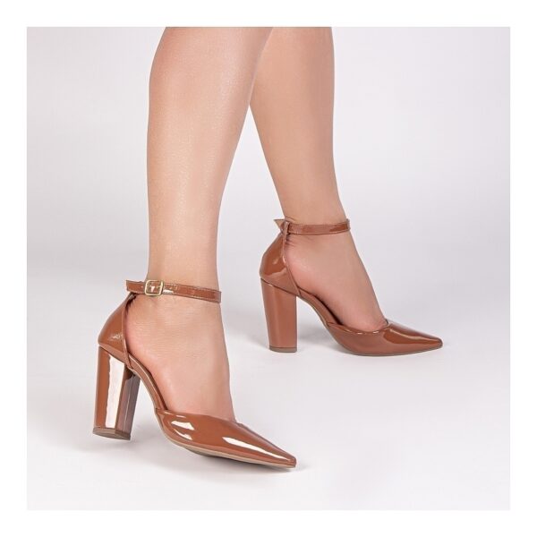 Salto: 9 cm de Altura encapado em Verniz Caramelo;