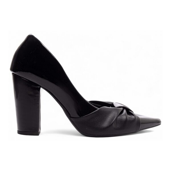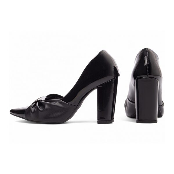 Salto: Grosso com 9 cm de Altura Revestido em Verniz Preto;