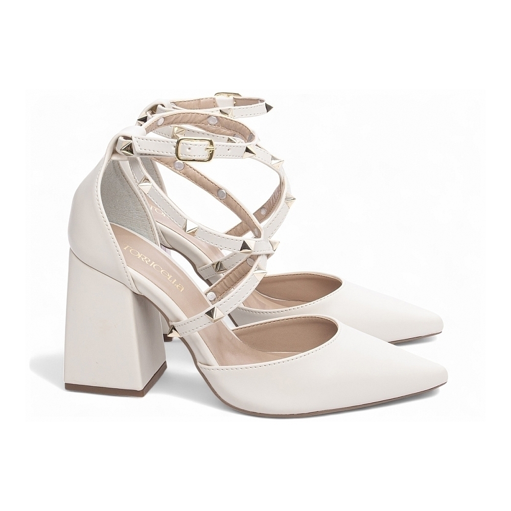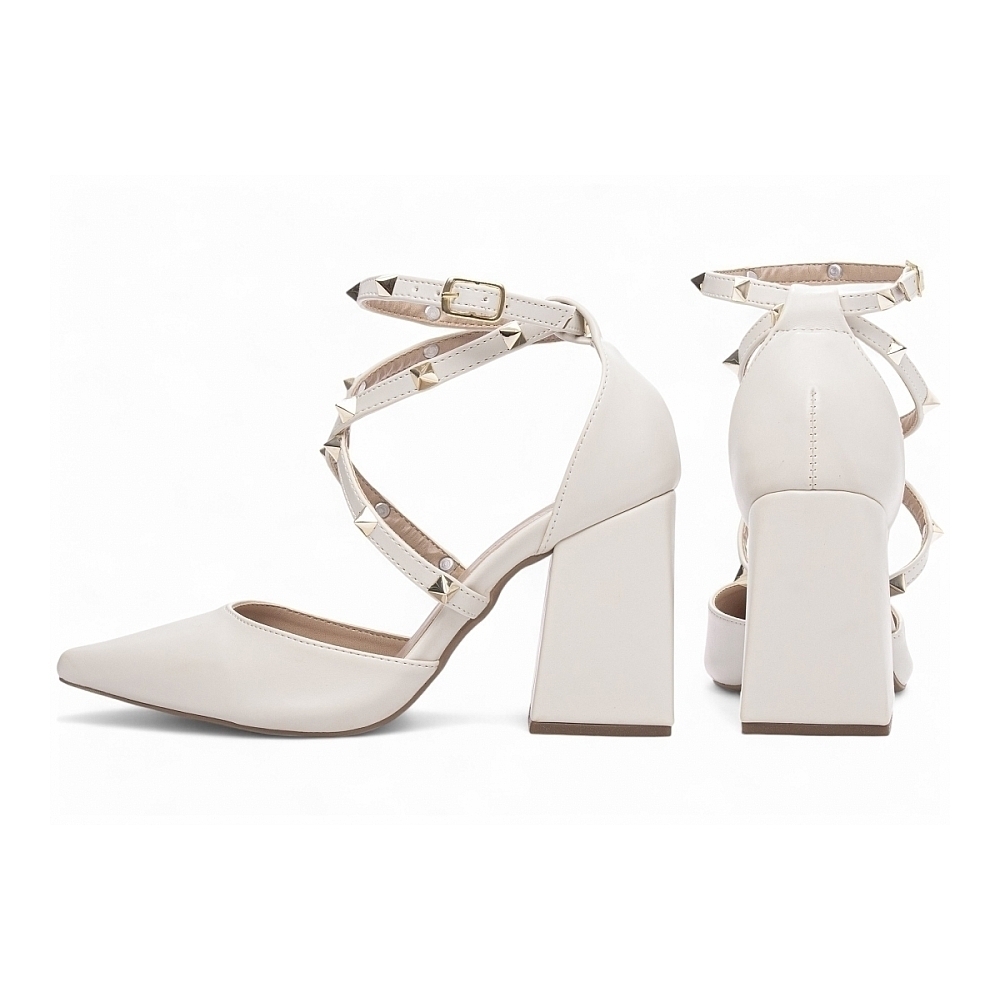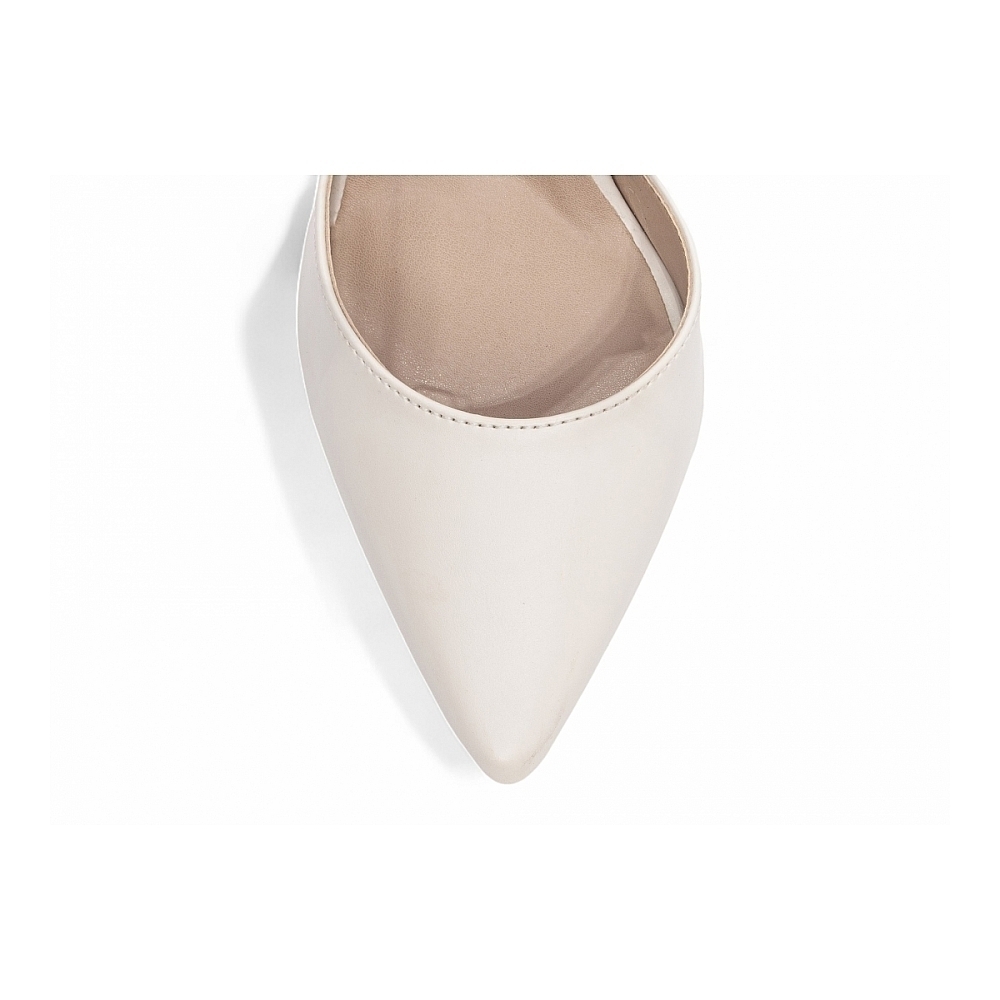 Palmilha: 8 mm de Espessura, Espuma em EVA, Revestida em Napa Off White e Taloneira Napa Bege;