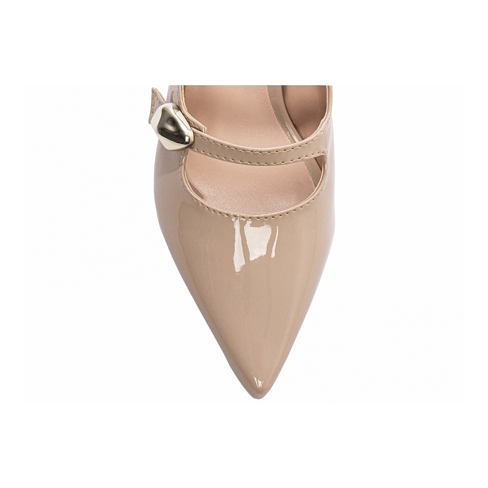 Palmilha: 8 mm de Espessura, Espuma em EVA, Revestida em Verniz Bege e Taloneira Napa Bege;