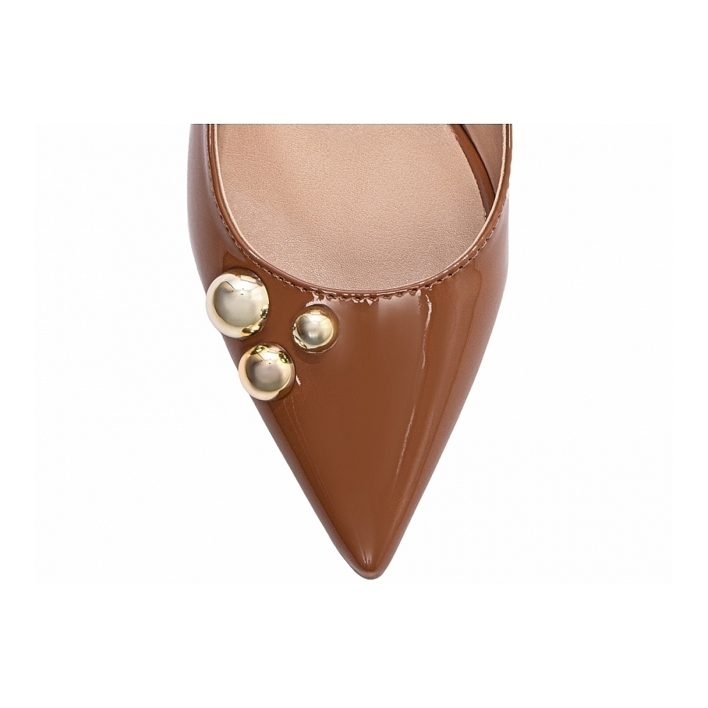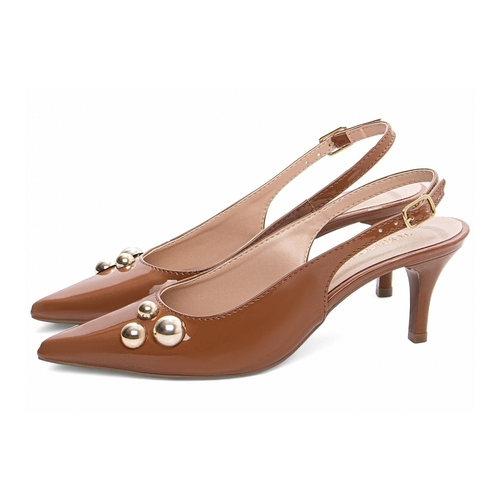 Palmilha: 8 mm de Espessura, Espuma em EVA, Revestida em Verniz Caramelo e Taloneira Napa Bege;